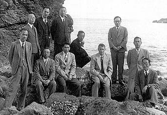 Members of the Nagasaki City Medical Association gathered at Mogi in May 1951 for the author’s farewell party: seated, from left, Harakichi Imamura, the author, Shigekuni Aritomi, Stanley Wright, and Etsu Osuga; standing, from left, Masao Ide, Kihachi Shinagawa, Yoshiro Shibata, Uraji Hayashida, Shunsuke Hayashida, and Yuzo Tomonaga.