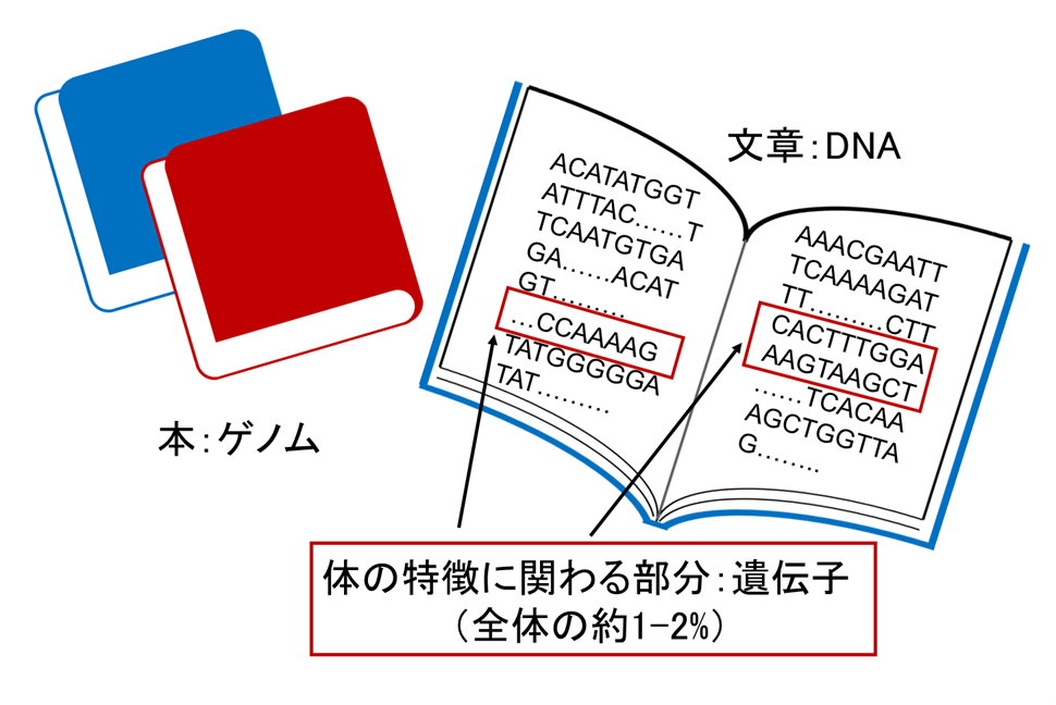 A. 私たちの体を作っている約37兆個の細胞の一つひとつには、生命を維持するために必要な情報が含まれています。その情報を持っている分子がDNAで、ヌクレオチドと呼ばれる小さな分子が集まってできています。私たちの細胞には、およそ30億塩基対分のDNAが含まれており、これらすべてを合わせたものを「ゲノム」と呼びます。 ヌクレオチドは、本に使われる一文字一文字にたとえることができます。文字が長く並んだ文章全体がDNAであり、その文章をすべて集めたものがゲノムです。 その中で、目の色や血液型など、特定の性質に関わる情報をもつ部分は「遺伝子」と呼ばれます。ゲノム全体のうち、遺伝子として働いている部分は、わずか1~2%程度にすぎません。