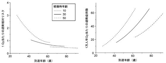 原爆放射線により被爆者にがんを生じる確率(過剰生涯リスク)は、受けた線量、被爆時年齢および性に依存している。図2に、1 Gyに被曝した時の過剰相対リスクと過剰絶対リスク(男女平均)を示す。どちらの過剰リスクも、被爆時年齢が低いほどリスクが高いことを示している。このほかにも、女性は男性より放射線被曝によるがんリスクが若干高いことが分かっている。